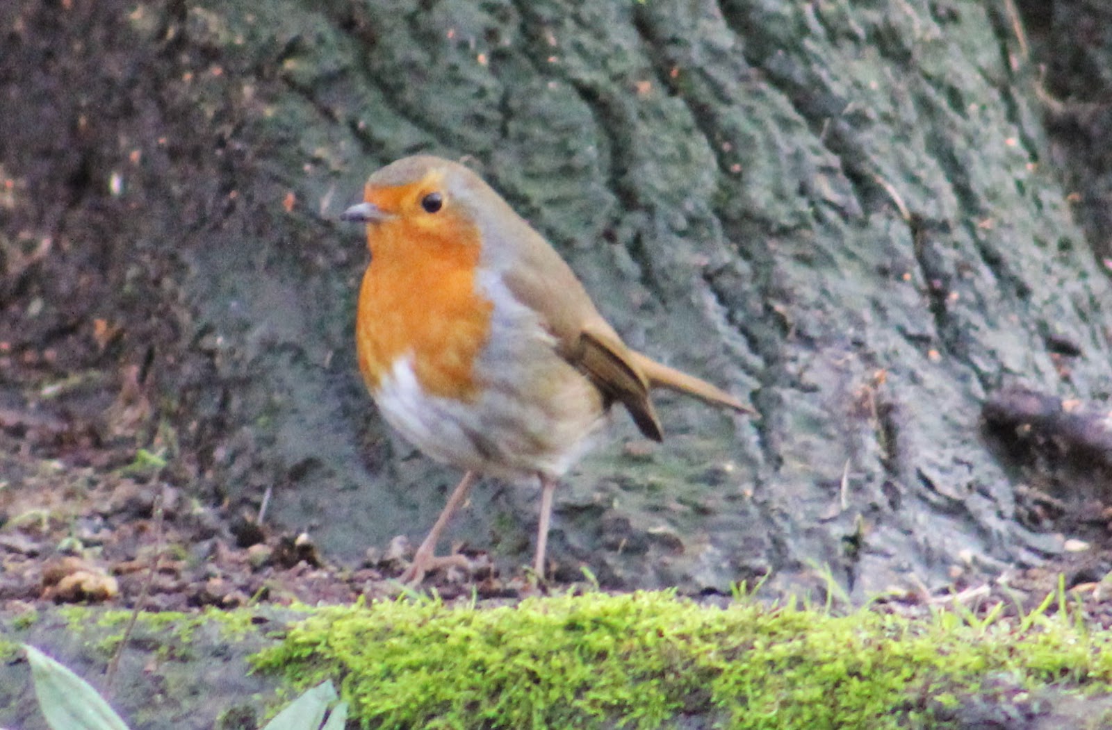 He perches high on a bough among the ivy and serenades me at the top of his voice. I try to whistle Carly Simon's "Robin" and I think he has started recognising me by these unaccomplished efforts. Anyway as our friendship grew he became more and more adventurous. One day I saw Malinovka by the foot of a large oak tree. He had come to meet me. Perhaps he recognised my two dogs, Max and Tyson.